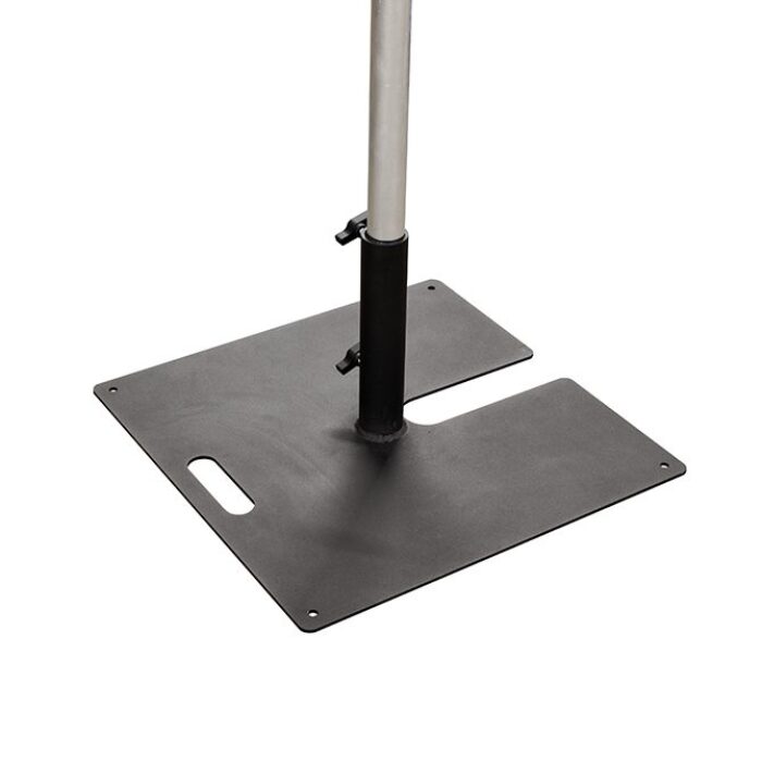 The industry standard. The Doughty Tank Trap provides the means to support a 48.3mm vertical tube or scaffold pole and is ideal for side lighting. Consists of a 600mm square steel plate with a 50mm receiver welded to it. There is a cut out in the base to allow compact stacking for transport and storage.